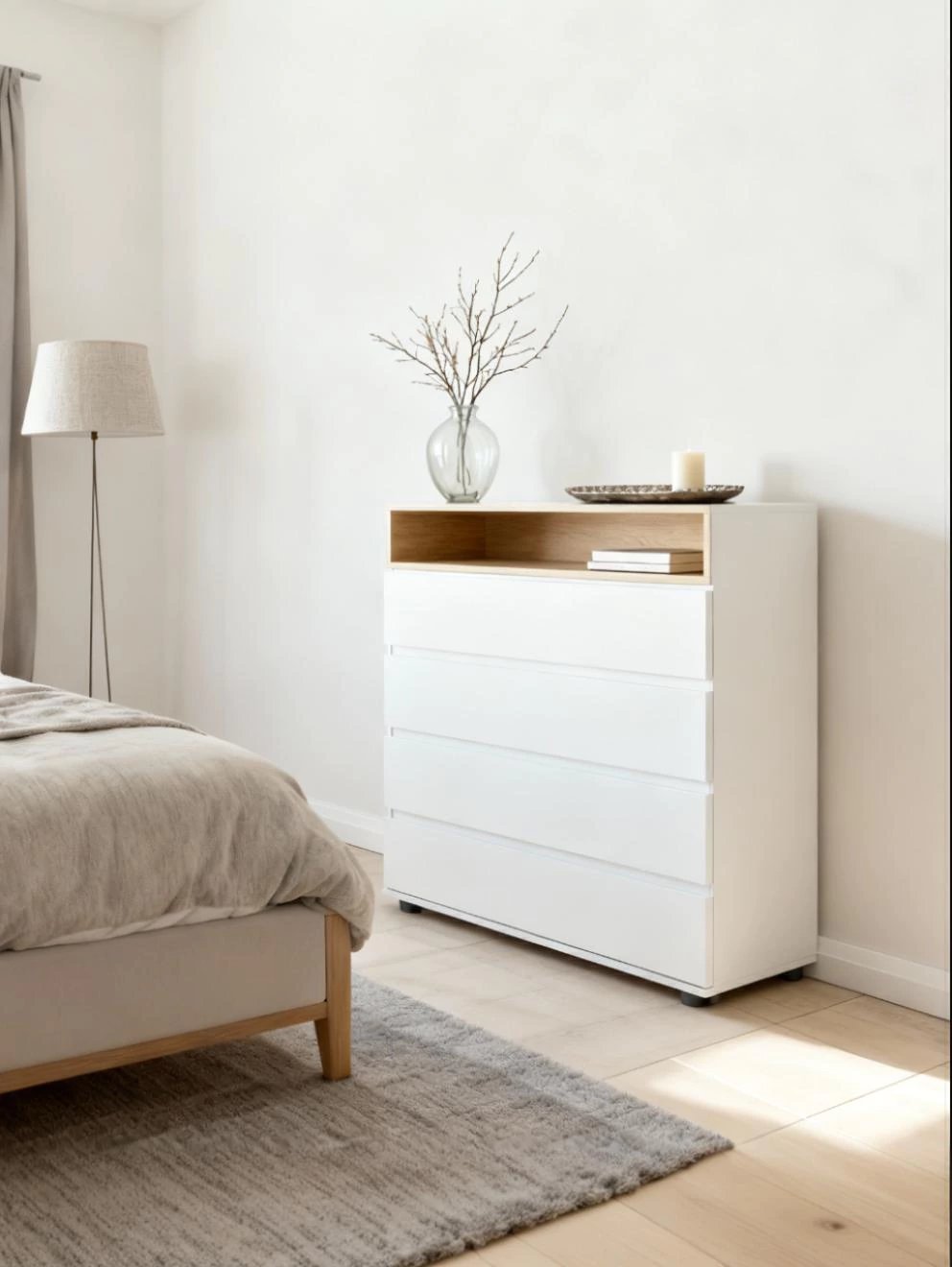 Fabricada en melamina Egger de 18mm, cantos en PVC, revestida en Blanco sobre aglomerado de 18mm.
